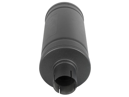 Wake up your stock exhaust or build your own custom exhaust with aFe POWER's high flow, stainless steel, universal fit MACH Force-Xp muffler. Designed to provide a deep, throaty, powerful sound on acceleration yet maintains a smooth sound at idle, this muffler is made of 409 stainless steel and uses a straight through perforated core with heat resistant packing to reduce backpressure and maximize exhaust flow to improve performance and sound. Finished with a corrosion resistant high temp metallic black powder-coat for long lasting good looks. Stainless Steel Construction: Constructed of 409 stainless steel for long lasting strength and durability. High-Temperature, Metallic Black Powder Coating: Helps prevent corrosion, deepen the exhaust tone and give it a custom look. Design and Sound: Designed for exhaust gasses to travel straight through the heat resistant perforated core for a remarkable tone. Universal Fit: Universal muffler fits 2-1/2" stainless steel tubing. Muffler comes slotted. Stamped with an aFe POWER logo: Features an aFe POWER logo stamped onto the muffler for quality, brand authenticity. Muffler Specifications: Configuration: 2-1/2" Center Inlet / 2-1/2" Center Outlet. Size: 14" body length x 6" diameter round body, slotted.