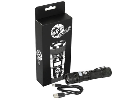 Put some powerful light on your subject with aFe Power's super bright CREE LED 950 lumen flashlight. This compact flashlight features a water and shock proof, anti-slip textured aluminum body and adjustable permeable optical glass to increase brightness. Perfect for wrenching in the garage and outdoor use, the aFe Power LED flashlight is rechargeable through a built-in Micro USB port and features 5 light modes: high, middle, low, strobe and SOS. Fully zoomable from wide to narrow beam and can run up to 2 hours per charge on high mode.