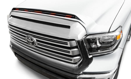 Calling all road warriors, overlanders, and daily drivers! Light up the trail or illuminate the night with the Aeroskin LightShield Pro Color Match. It is the first hood deflector featuring amber LED running lamps with multiple light output sequences for added flash and function and available in many popular OEM paint colors. The custom-molded from Dura-Flex 2000 TPO material comes in a single-piece design that redirects airflow over the top of your vehicle to divert road debris and shield your hood and windshield from bugs, chips, dents, and dings. Proudly made in the USA.