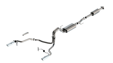 The Borla(r) Cat-Back(tm) system 140862 was specifically designed to enhance the power and sound of the Ford F-150 equipped with 2.7L and 3.5L engines. It includes bright chromed T-304 stainless steel tips and a split rear exit configuration. The entire system is made of T-304 stainless steel and utilizes computer numerical control (CNC) manufacturing techniques that ensure an accurate fit. This system features the "Touring" sound that gives you a mild sound of power with no drone. It is also available with black chromed tips (part number 140862BC). There are additional systems available for the 2.7L and 3.5L F-150 that offer different options for sound level, tip finish and tip exits. All this is backed by our unsurpassed Million Mile Warranty., System Features:, Cat-Back(tm) System, Split Rear Exit, Bright Chrome On T-304 Stainless Steel Tips, Touring Sound Level, T-304 Stainless Steel Construction, Bolt-On Installation, Million Mile Warranty