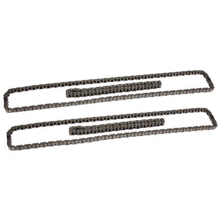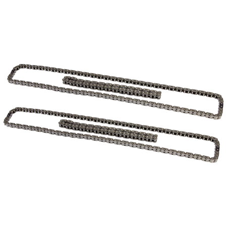 The COMP Cams Hi-Tech Timing Chain Sets for Ford Coyote engines are designed to withstand the stresses of upgraded, modified applications and are the perfect choice when replacing fatigued, worn out factory chains. Any time the cams are being upgraded in a Ford Coyote engine, or it is being built for high RPM racing use, replacing the tired, stock timing chains is a must. The new COMP Cams Hi-Tech Ford Coyote Timing Chain Sets feature heavy-duty secondary chains with 15% thicker plates than the factory chains, which helps to prevent common secondary chain failure. These kits also include premium quality primary chains that are ideal for any high performance or racing application. Whether simply upgrading camshafts or doing a full race engine build, these timing chain sets provide the durability needed in aggressive racing environments. Sets include two primary and two secondary chains.