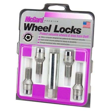 Protecting the world's finest wheels and tires from theft since 1964.; Wheel Lock bolts are designed in USA and manufactured in EU and USA.; Presently, McGard is an Original Equipment wheel lock supplier to most automobile brands around the world.; These easy-to-use wheel locks function like regular lug bolts, but require a special key tool for installation and removal.; The steel collar on the user friendly key guides the key into the lock pattern.; The collar holds the key in alignment for easy installation and removal.; The computer generated key designs allow for an infinite number of key patterns.; The extra narrow pattern groove on the lock resists the intrusion of removal tools into the pattern.; Every McGard wheel lock utilizes fully machined, restricted chemistry steel made specifically for McGard and through-hardened for its unsurpassed level of security.; McGard's plating process includes several layers of nickel and one layer of microporous chrome producing a superior finish while protecting against rust.; The bolt stem has a dacromet coating to meet O.E.M.; standards.; For use on tuner wheels or wheels with very small lug nut holes.; For aluminum wheels only. This product contains globally sourced materials/components.