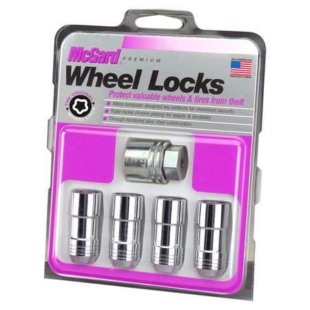 Protecting the world's finest wheels and tires from theft since 1964.; McGard manufactures wheel locks in the USA to meet or exceed O.E.M.; standards for safety and durability.; Presently, McGard is an Original Equipment wheel lock supplier to most automobile brands around the world.; These easy-to-use, one-piece wheel locks function like regular lug nuts, but require a special key tool for installation and removal.; The steel collar on the user friendly key guides the key into the lock pattern.; The collar holds the key in alignment for easy installation and removal.; The computer generated key designs allow for an infinite number of key patterns.; The extra narrow pattern groove on the lock resists the intrusion of removal tools into the pattern.; Every McGard wheel lock is fully machined from restricted chemistry steel made specifically for McGard and through-hardened for its unsurpassed level of security.; McGard's plating process includes several layers of nickel and one layer of microporous chrome producing a superior finish while protecting against rust.; This product may contain globally sourced materials/components.