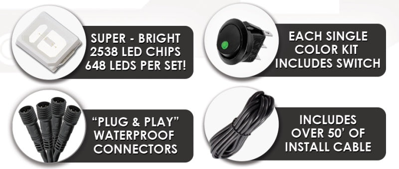 NEW! Double the LEDs. Double the Brightness! Are you looking for the brightest and most attention-grabbing LED wheel ring kit on the market? Look no further than the all-new Double-Wide LED Wheel Ring Kit from ORACLE Lighting! With over 600 LEDs these rings make a powerful impact on any vehicle! The all-new design features ?Plug and Play? waterproof connectors for easy installations. Each ring has over 12? of insulated cable that connects to a wiring hub which makes installation easier than ever. The rings now include (5) mounting brackets per ring and have tapped fittings to easily move and adjust brackets to fit any application. The ring diameter has been increased to 16.5? to fit oversized performance brake systems. ORACLE Lighting illuminated LED wheel rings are an easy and effective way to light up your truck?s wheels and suspension! This head-turning lighting product consists of a set of (4) LED illuminated aluminum rings which install around the brake rotor and attaches to the brake dust shield. These can also be mounted to older vehicles with drum brakes. The effect is a large ring of light which accents custom wheels and stands out at events. Oversized 16.5? diameter is the largest on the market and fits oversized brakes. Each ring is equipped with 162 super-bright 2835 LEDs (648 LEDs total) which will outshine any competitors.
