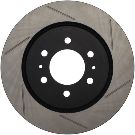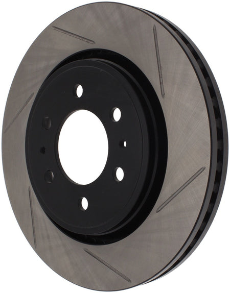 StopTech Slotted Sport Rotors are 1-piece direct replacement brake discs for factory brake systems and stock calipers that look great behind your wheels – and offer significantly improved braking performance. The unique slotting aids with heat and brake dust dispersal, prevents glazing of the pads, adds bite and improves wet and dry braking performance. Built to last, the black e-coating provides protection from corrosion and the high carbon metallurgy (in most applications) offers quieter operation, better crack resistance and increased performance.