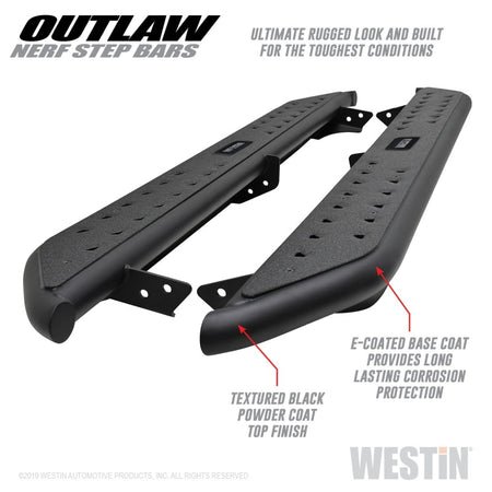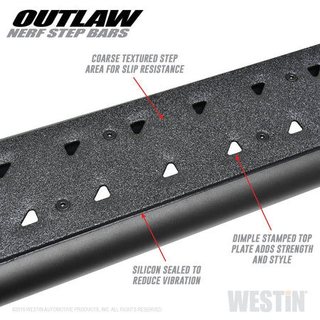 Westin's Outlaw Nerf Step Bars offer the perfect balance between function and strength resulting in the ultimate rugged look designed to last and impress. Engineered to fit tightly against rocker panels, the Outlaw Nerf Step Bars provide a solid fit and superb protection while simultaneously improving vehicle cab access. Whether you are an avid overlander or simply an off-roader, rest assured you will be safely stepping into your vehicle with a 16 gauge steel coarse step surface and 2" diameter tubing. Featuring bolt-on installation, an e-coated base coat and textured black powder coat top finish, Westin's Outlaw Nerf Step Bars are the ideal match for the toughest of conditions.