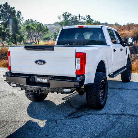 "Stand out from the Competition" with the all new HDX Bandit Rear Bumper from Westin. Built to compliment the style, precision, and durability of the matching HDX Bandit Front Bumper, this all new "off-road style" rear bumper, is clearly a cut above. Unlike the competition, which features an overlapping two piece design and an ugly weld which can warp the metal and is prone to rust, the new HDX Bandit Rear Bumper features an extremely clean, one piece design. The stamped diamond plate step surface is constructed of 11 gauge plate steel and features a welded inner structure for maximum strength. A unique "corner step" design provides extra wide step area to allow easy access to bed and cargo area. HDX Bandit Rear Bumper includes hardware, mounting brackets, flush mount LED license plate lights and two standard LED back up lights. Fully compatible with blind spot monitors and parking sensors, and can also accommodate an OEM hitch. HDX Bandit Rear is designed for heavy duty performance and extended life that is backed by a 3 year warranty with a black powder coat finish. The new HDX Bandit Rear Bumper is truly in a class by itself.